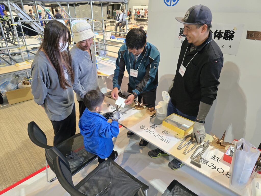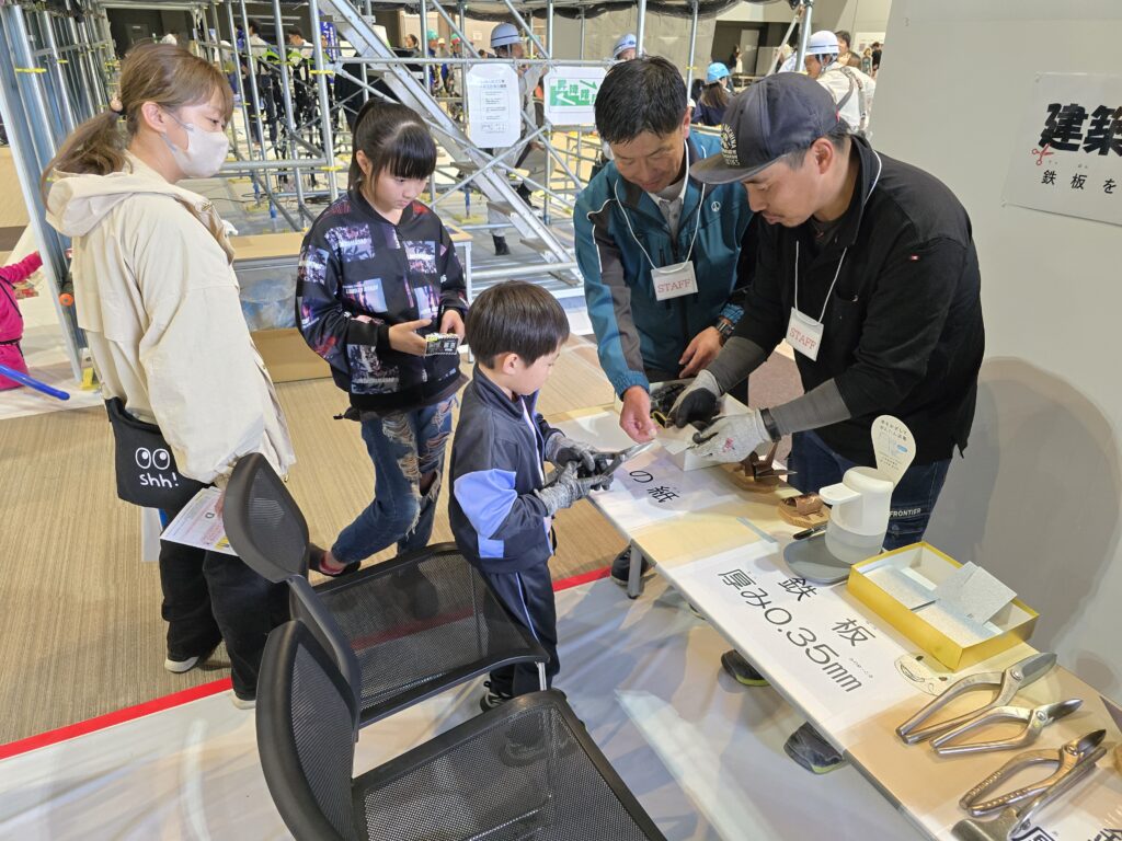 当社ブースでは、建築板金の仕事を体験できるコーナーを設け、実際の道具を使った作業体験を実施しました。普段はなかなか触れる機会のない職人の道具や作業に、親子で楽しみながら挑戦する姿が多く見られました。
