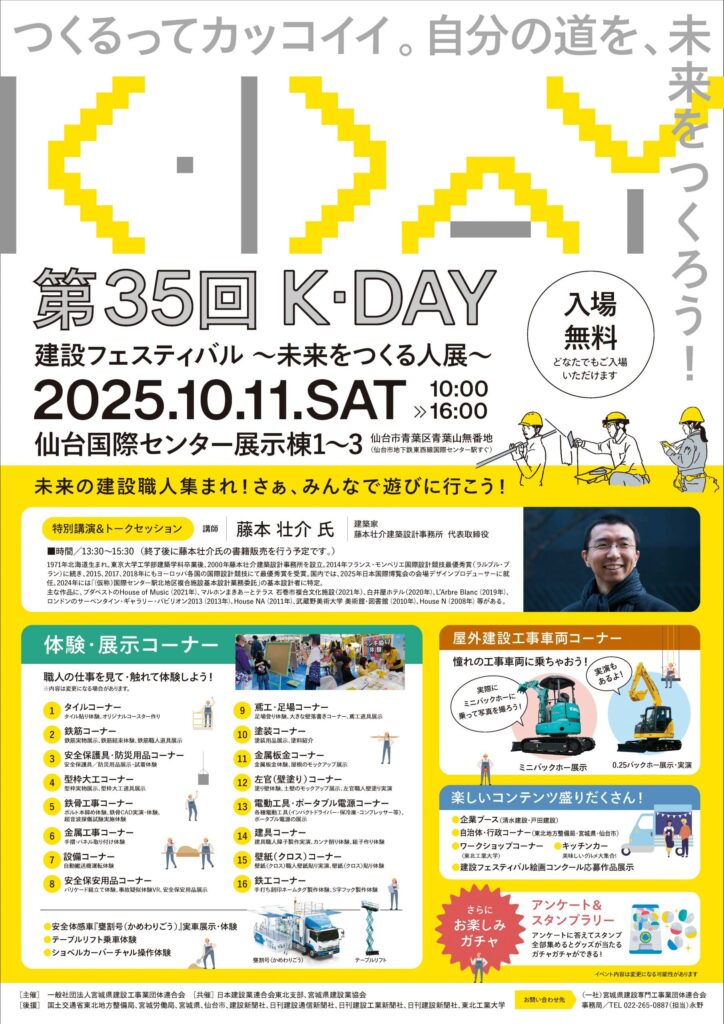 2025年10月11日(土)、仙台国際センター展示棟にて開催された「第35回 建設フェスティバル『K・DAY』」に出展いたしました。
